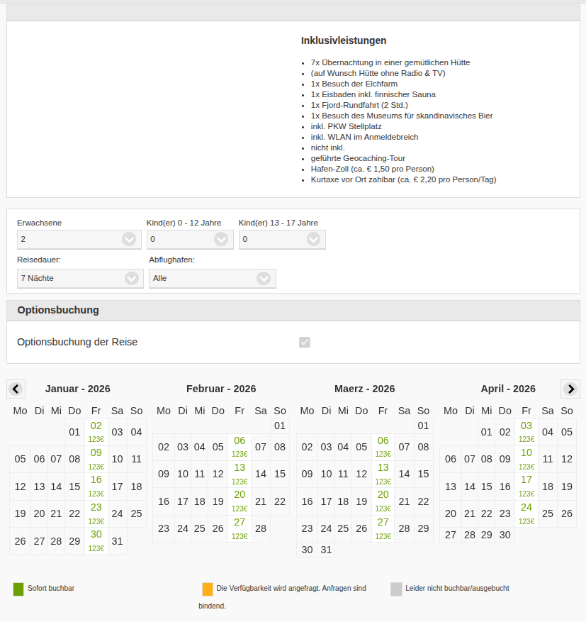 Wenn sie mit der Maus über die Kalendertage fahren, wird bei Buchungen auf Anfrage angezeigt, warum diese nicht sofort buchbar sind. Folgende Konstellationen sind möglich: