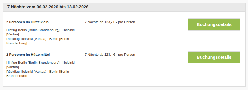 Hier werden alle Informationen zu de Reise wie Reisezeit, Flug (wenn vorhanden), Inklusivleistungen, Verpflegeung, Personen … nochmal zusammengefasst.