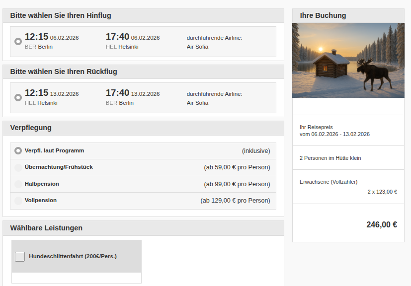 Abhängig von der Konfiguration der Reise werden in den 6 Schritten folgende Buchungsoptionen angezeigt: