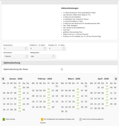 1. Schritt: Anzeige Inklusivleistungen, Auswahl der Personenzahl, Flüge, Terminkalender