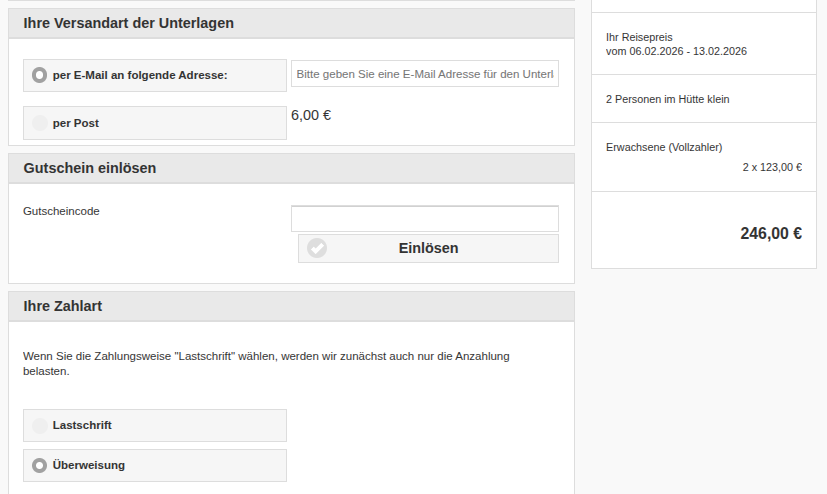 Hier kann man nochmal den Reisepreis ansehen, Zusatzleistungen buchen, Gutscheine einlösen. Außerdem kann man die Versandart der Dokumente wählen. (Mail, Post)