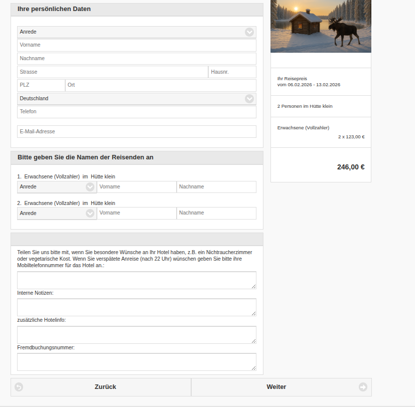 Im letzten Teil werden die Kontaktdaten der buchenden Person sowie die Reiseteilnehmer eingetragen. Ganz unten besteht noch die Möglichkeit Kundenwünsche, interne Notizen, zusätzliche Hotelinf & Fremdbuchungsnummer einzutragen. Das letzteren 3 Felder werden nur bei Buchungen direkt aus dem Travelseller angezeigt. Bucht ein Kunde über die Webseite, erscheint nur des Feld “Bemerkungen & Wünsche”.